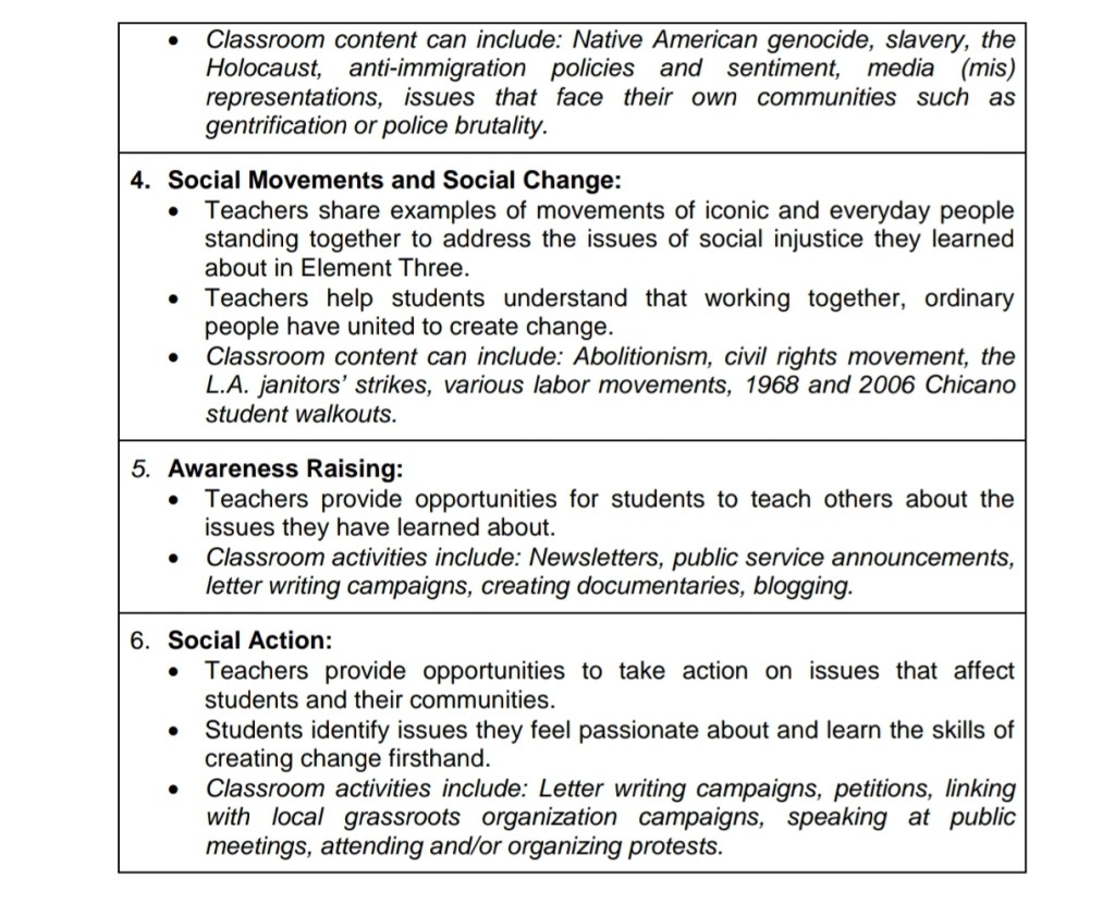 The workshop introduced me to Social Justice Framework for Teaching by Bree Picower. Picower highlights 6 elements to consider in a social justice curriculum design.